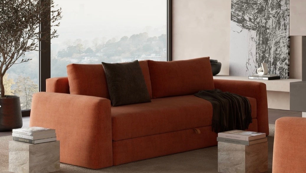A convertible sofa bed which can improve the use of small living spaces. The CONE 59x90" has an integrated storage box for bedding. It has a sleeping area Queen size: 59" x 79" / Comfort: Pocket spring / Matt black steel frame & legs / Headrest optional / Bedding box - included / . Decorative pillows and any other accessory is not included. Made by Innovation Living, a Danish Furniture world Leader since 1975! Optional CORNILA Ottoman $849. Made on “538 Melange Light Grey” and on “579 Kenya Gravel”, 282 Avella Warm Grey, 412 Esina Rust Orange and many other fabrics to choose from by special order for additional $300 charge and 3-4 months of production waiting time. 5 Years of Warranty on Manufacturer’s defects on this item and 30 days Satisfaction Guarantee! Optional Cornilia Ottoman 30x30x17" $789. Optional ¨Set Up¨ Assembly cost of $70.